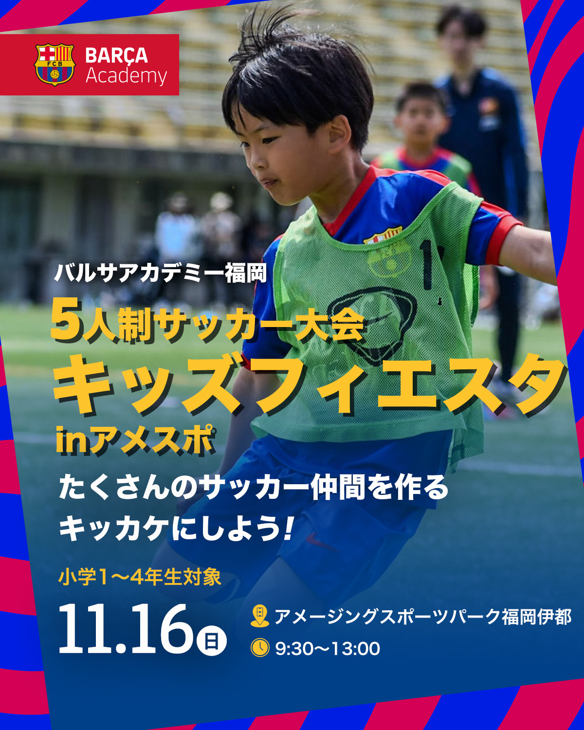 11/16(日) 5人制サッカー『キッズフィエスタinアメスポ』開催!小学1〜4年生対象!バルサアカデミー生以外も参加可!
